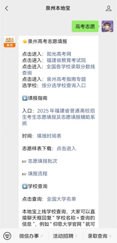 温馨提示:微信搜索公众号【泉州本地宝】,关注后在对话框中回复【高考志愿】可获福建高考志愿填报入口、填报时间表/填报流程/学校推荐、大学名单/往年分数线查询、最低录取分数线/成绩排名等信息。