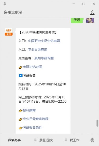 温馨提示:微信搜索公众号【泉州本地宝】,关注后在对话框中回复【考研】可获研招网入口(报名/查专业)、初试时间/网上报名及确认时间、报名条件/流程、历年国家线、各大学招生信息网等信息。