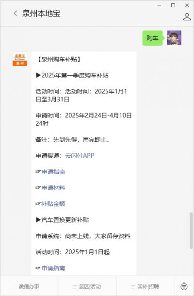 温馨提示:扫描上方二维码关注【泉州本地宝】公众号,关注后在对话框回复【购车】可获泉州购车补贴政策(含国补)、补贴申请入口/申请指南、补贴金额/发放时间最新消息、名单公示查询等。
