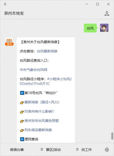 微信搜索公众号【泉州本地宝】,关注后对话框回复【台风】,可获取泉州台风最新消息、台风实时路径查询入口(位置/登陆时间地点)、列车停运/景区关闭/天气查询(暴雨)/预警信号等信息!