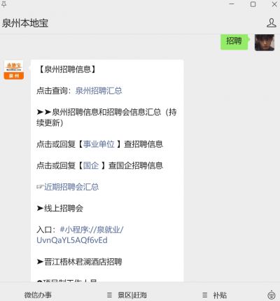 ,关注后对话框中回复【招聘】可获取泉州招聘汇总、就业补贴信息、热门招聘、招聘会时间及地点、国企/事业单位招聘、招聘网站入口等信息。